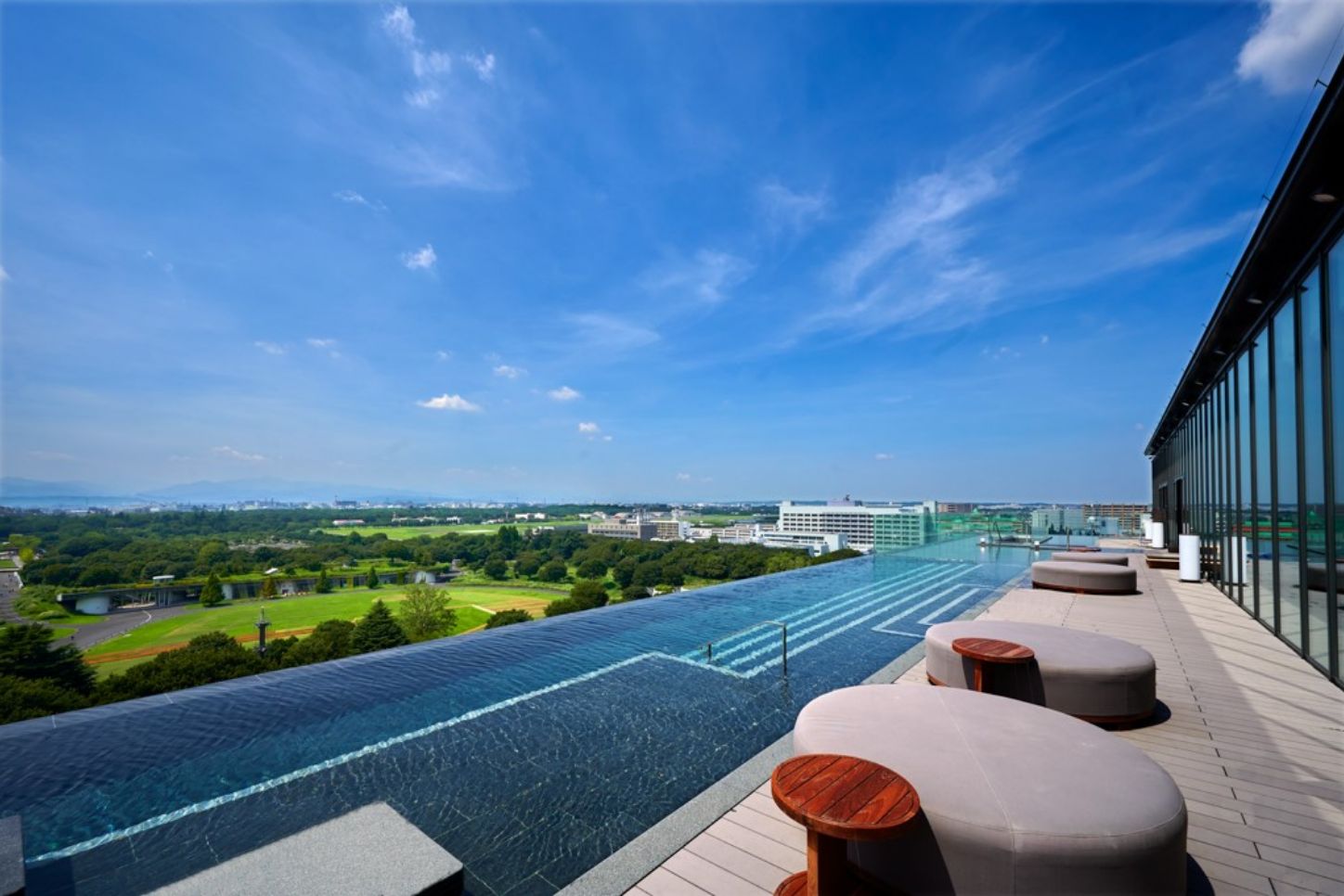 独自に掘削した温泉水を使用した最上階のインフィニティプールを