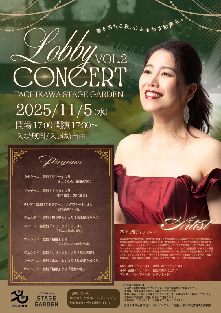 株式会社立飛ホールディングス(本社:東京都立川市、代表取締役社長:村山正道)と一般社団法人立飛教育文化振興会は、令和7年11月5日(水)に「TACHIKAWA STAGE GARDEN ロビーコンサート Vol.2」を共同開催いたしますので、お知らせいたします。