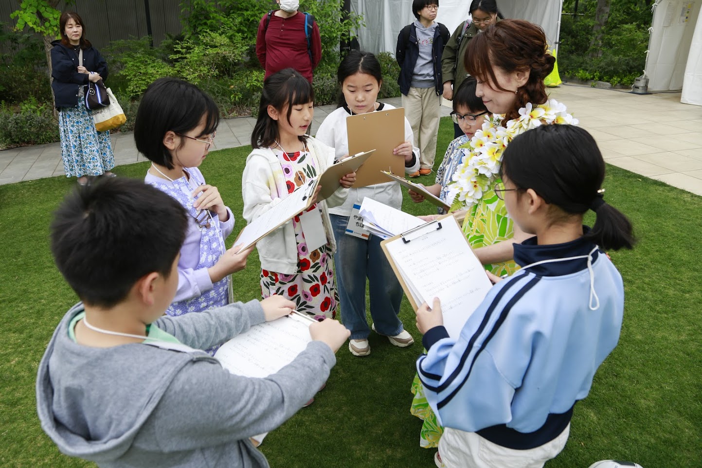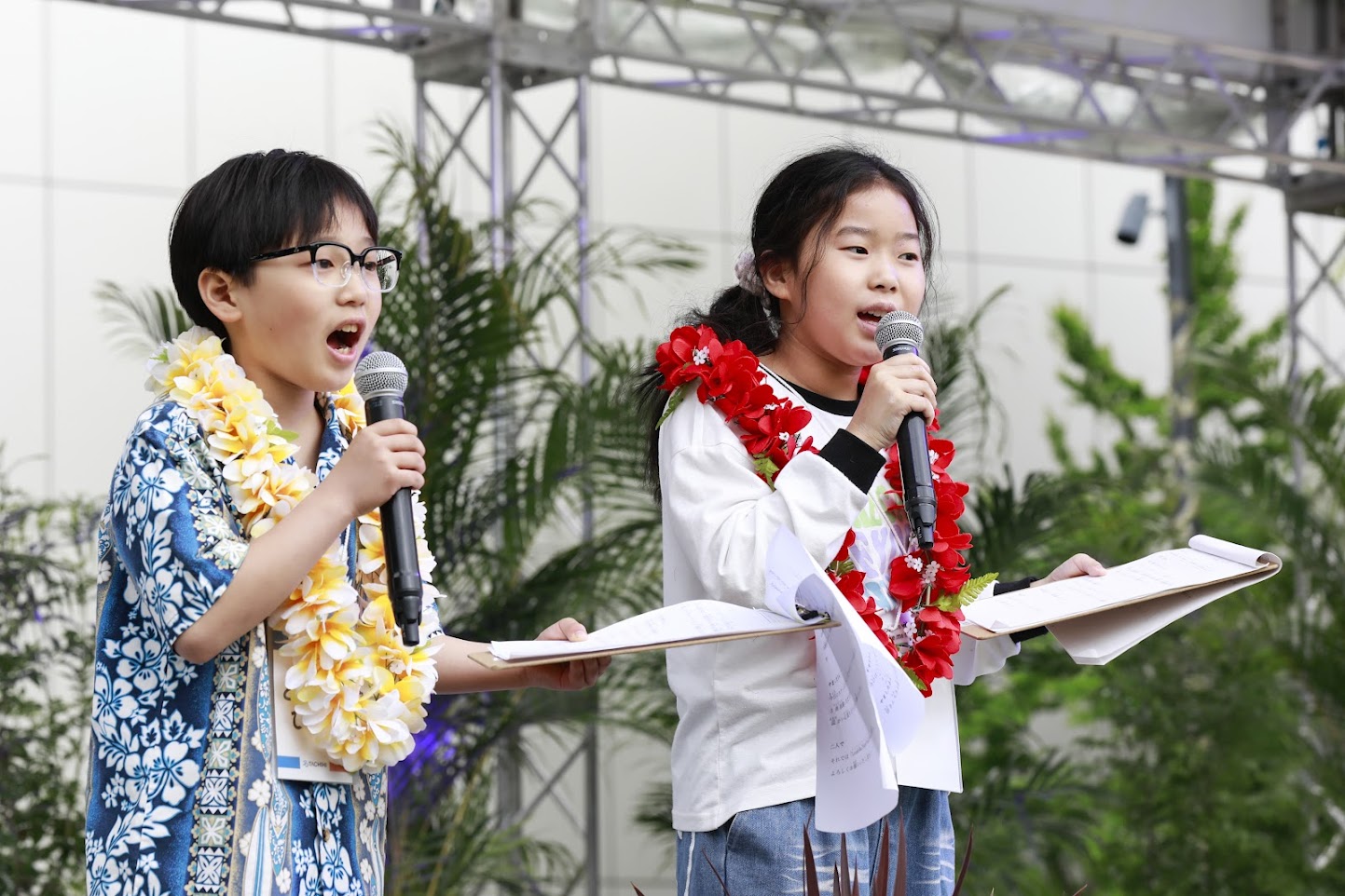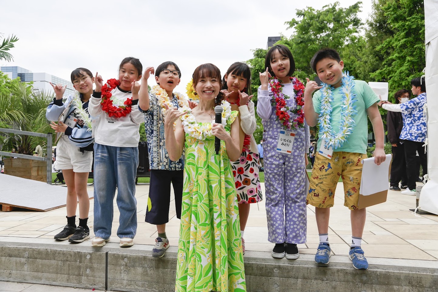 イベントMC体験コースは、事前申し込みいただいた立川市内の小学校に通う5年生~6年生の児童6名が参加し、令和7年4月26日(土)に開催した立飛グループ創立100周年記念事業「Aloha Hawaiian Festival 2025」にてイベントステージの司会進行に挑戦しました。
